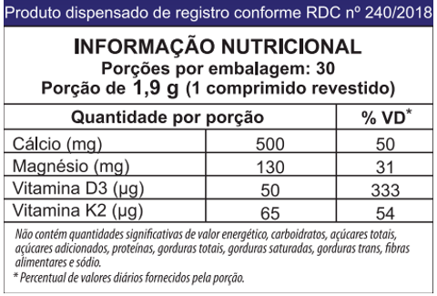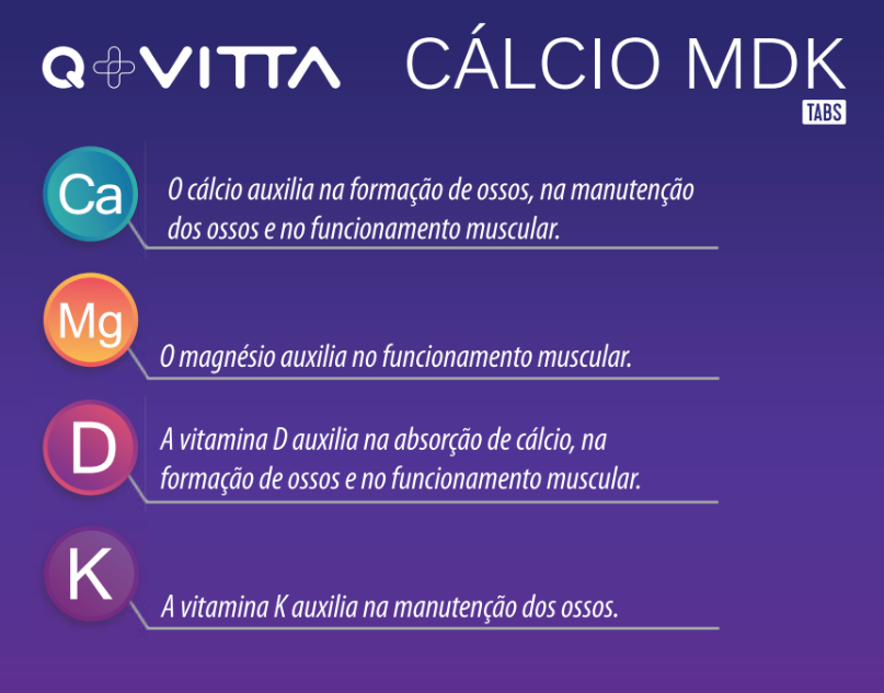 Cálcio MDK TABS combina três nutrientes essenciais para a saúde óssea: Cálcio, Magnésio, Vitamina D3 e Vitamina K2. Uma fórmula completa para quem busca fortalecer ossos e dentes, melhorar a absorção do cálcio e contribuir para o bom funcionamento muscular.
